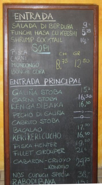 There were plenty of other interesting choices: beef – stew and tongue – and various fish, including whole grouper, cod, and minced shark, all served with pan bati (a thick, dense, fried bread), rice and peas, and salad. (Prices are in Aruban florins, worth $.56.)