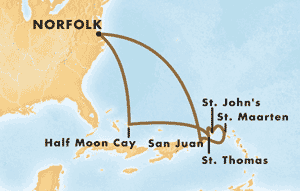 What attracted us, in addition to the last-minute price that was almost as cheap as staying at home, was the new Holland America Line port: Norfolk. No airport hassles, not to mention the possibility of weather delays jeopardizing the whole trip. And we did hear from the Captain that they delayed embarkation for about twenty people who had encountered weather difficulties. We had seen them scurrying aboard during the lifeboat drill, but the ship departed without three others who didn't make it in time. Since their flight reservations had been made through HAL, they were flown to the earliest feasible port of call, St. Thomas. However, they did miss the first three days of the ten-day cruise – it's a long sail to the Caribbean, and the first stop is at Half Moon Cay, HAL's private island in the Bahamas.