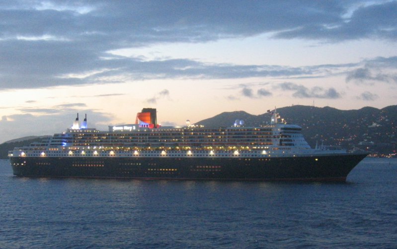 This year, the eastern Caribbean was awash with ships, including some of the new monsters. Twice the QM2 was in the same port as we were – this photo is at Sint Maarten. She's really impressive from a distance – as dusk approaches, "Queen Mary 2" in white neon leaves no doubt of her identity.