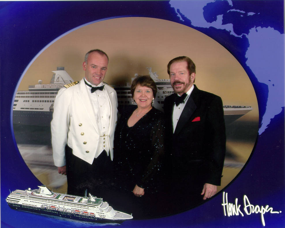 If you haven't been on a cruise, you may not realize that a significant source of revenue must come from the photos taken at every opportunity–when initially embarking, when disembarking at every island stop, and on formal nights in front of various romantic backdrops, as well as in the dining room. And, of course, with the Captain, at the entrance to his reception. The picture we had taken with him was a good one, so we bought it.