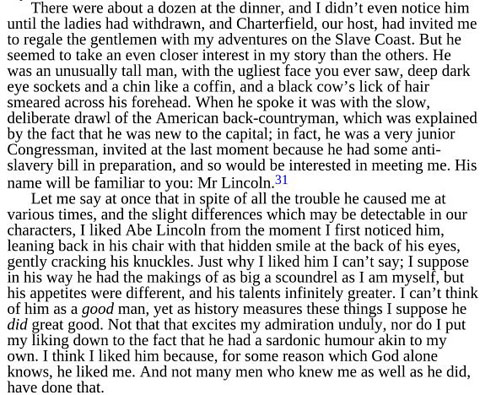 This excerpt from Flashman's account of that dinner gives you an idea of Fraser's style, and with the 31st footnote reference, to his level of research.