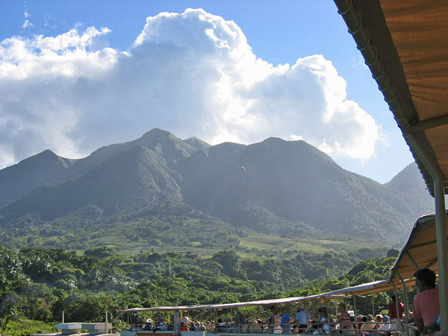 We had stopped at St. Kitts in 2001 but the island's attractions hadn't seemed that appealing. Highlights were the Brimstone Hill Fortress, also known as the "Gibraltar of the West Indies" – but we already had viewed it atop a towering cliff during our approach to Basseterre, the port and capital – and a rain forest. Since we had arrived several days early at the embarkation port of San Juan1, we had time to visit Puerto Rico's much more impressive El Yunque rain forest2. So we remained on board, but did enjoy the panoramic island view from the Crow's Nest Lounge. The later account of passengers who had taken an island tour convinced us it was the right choice at the time.