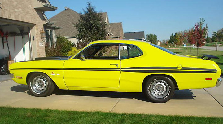 I then purchased a 1971 Dodge Demon 340 (cubic inch V8), for which I can't find a photo. This one, from the Internet, is nearly identical (I didn't order the optional hood scoops this one has) but it is same striking color, called "Citron Yella."