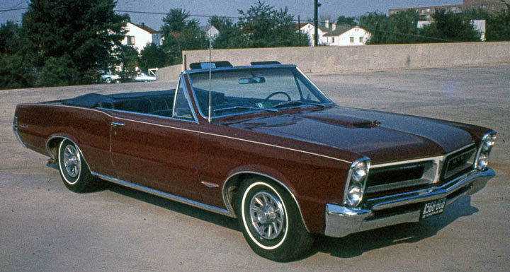 My first new car was a 1965 Pontiac GTO, with a 360 horsepower 389 cubic inch V8 engine with three 2-barrel carburetors, 4-on-the floor Hurst shifter, dual exhausts, Positraction (limited-slip differential) power steering, and power (metallic) brakes. Of course, nobody bought air conditioning for convertibles in those days – and it cost all of $3,600!