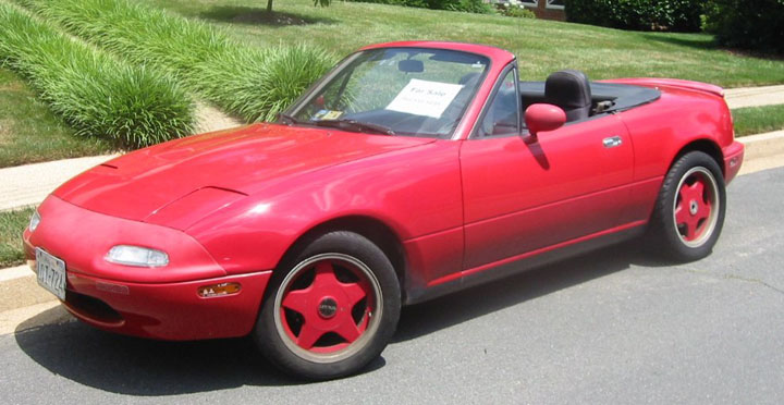 The next sporty car was a 1990 Mazda Miata with five-speed manual shift, which I bought used in 1992 after our return (this had a "For Sale" sign in case someone driving by might be interested). The custom wheels were installed by the previous owner. We enjoyed it for a long time, and I was considering installing a supercharger when some hard-to-diagnose problems occurred. I considered this to be an omen and decided it was time to start anew.