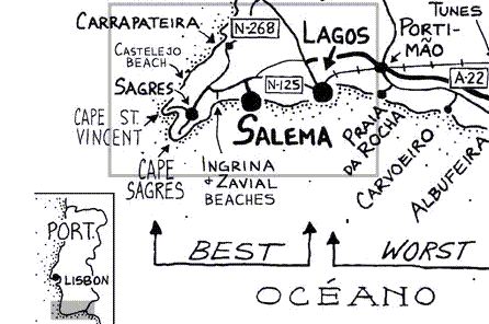 Here is Rick Steves' map of the Algarve – the print size indicates how well he likes each village or site. The "Best" area has so far remained unspoiled by the massive tourist development to the east. On a previous trip to Spain we had stayed in a similar untouristed village, Nerja, away from what he called the "Condo del Sol."