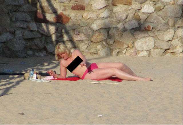 You might also notice a sunbather's legs protruding from the shade in the corner of the stone wall beneath the boats – some onlookers seemed to be interested. Her topless sunbathing was arranged rather modestly – at least until the moving sun forced her further onto the beach!