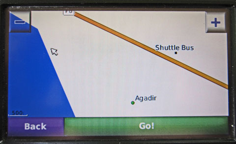 I had brought along my GPS, which included detailed street maps of Europe – but unfortunately not of Africa. However, I had saved the location where we got off the bus, so at least we knew in which direction we should head (the arrow shows our location on the beach). And, after several zigs and zags, we did arrive with time to spare.