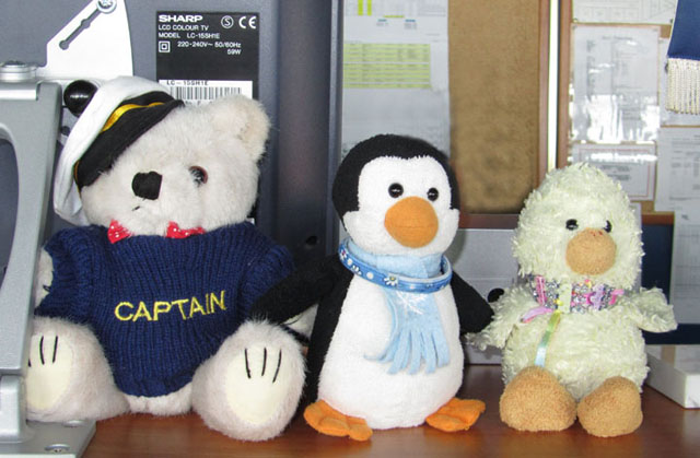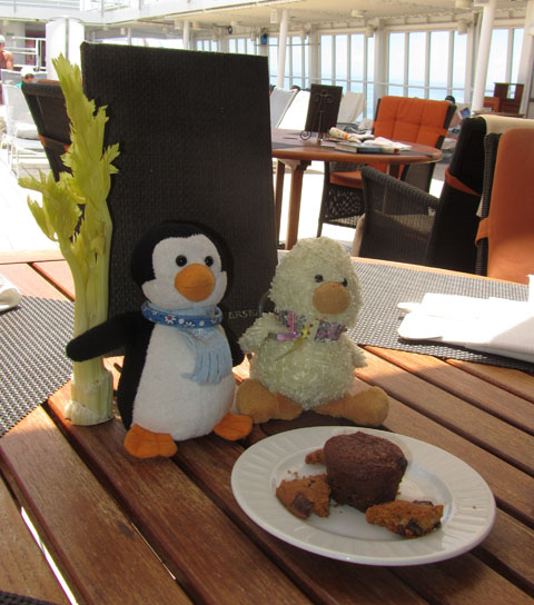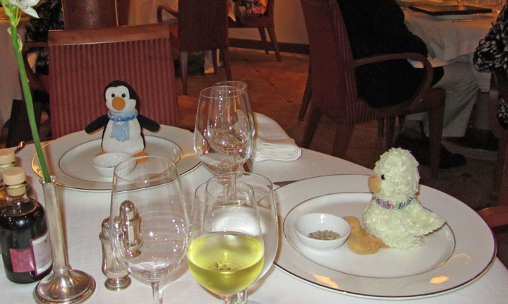 Peep & Flo became instant hits among the crew. When they were not perched on our table attracting compliments, people asked where they were. (Sometimes, when dining outside at the Terrace Restaurant, the wind was strong enough that we feared we would have to sound the alarm for "Bird Overboard!" so they would remain safely tucked in Betty Lou's purse.)