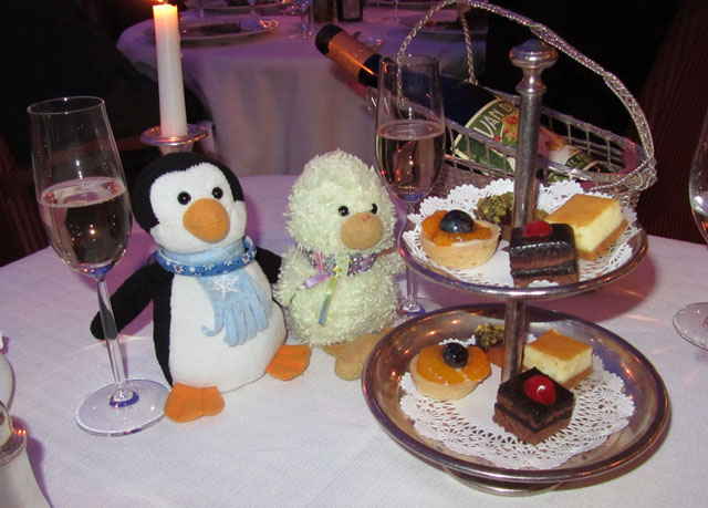 and on formal night, their own bird-sized glasses of Champagne and tower of sweets. Of course, Flo is always dressed for the occasion.