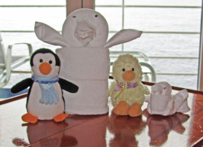 (In case you haven't been on a cruise where such creatures may appear on your bed at the end of the day, the talented cabin staff learn how to make various animals out of towels, or in the case of smaller ones, washcloths. In fact, there are even books about The Lost Art of Towel Origami.)