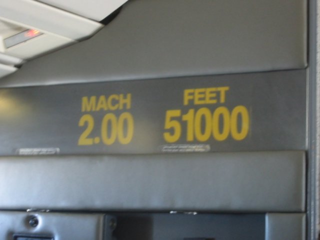 We were in the second row from the bulkhead, which gave us an unobstructed view of the Mach and altitude display mounted there. I took many pictures as we approached and passed Mach 1, but it soon became commonplace, so after that I only photographed Mach 2 (about 1,350 mph at cruising altitude).