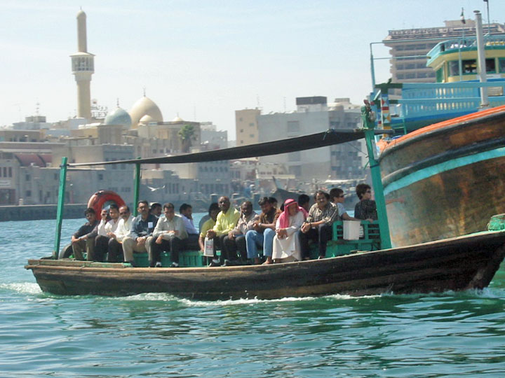 For one, we realized that we saw very few who looked like us. That started the game of "spot the Caucasian." Of course, one is more likely to find them near the hotels, the Dubai Museum, or the major gold shops. So far we've never encountered any on an abra, the small wooden water taxis that cross "The Creek," the inlet from the Gulf 3 that splits Dubai.