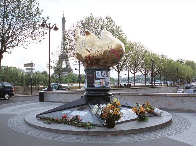 Never would we have believed that less than three weeks later, Princess Diana would die in the tunnel nearly underneath our café. (The cars descending on the right are in the opposite direction of her flight.) And that the flame would be turned into a memorial, and in the process disfigured, by some among her legions of admirers.