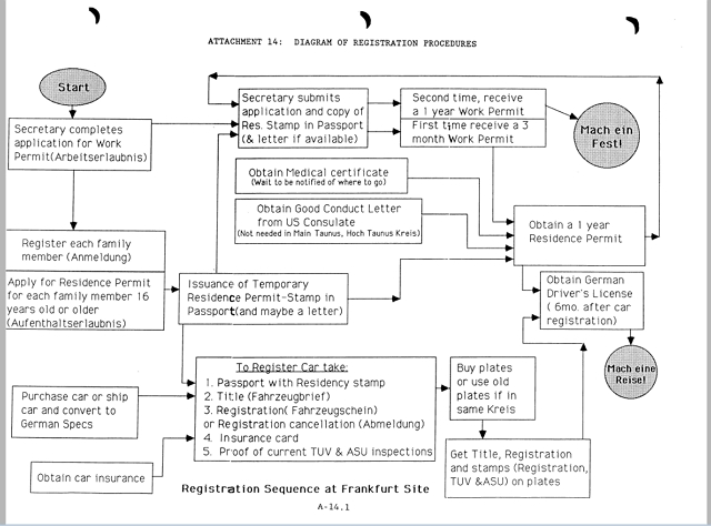 Of course, to earn so many stamps, one must first provide an equally impressive collection of paperwork. A colleague has likened the application process to a Treasure Hunt, where one has to gather many small objects from a list to win. The "Guide for MITRE Employees Transferring to the Frankfurt Site" has a full-page flow chart showing the sequence of steps required to obtain a basic set of documents: residence permit, work permit, driver's license, and car registration.