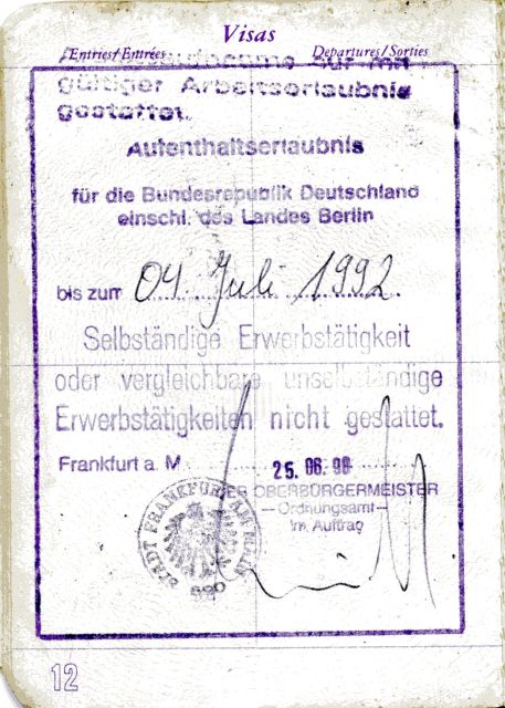 The first stamp includes an outer frame. A stamp at the top, some of which is outside the frame, says that I can work only with a valid work permit. The next stamp, three lines, with a space after the first one, says it is a residence permit for the Federal Republic of Germany, including Berlin (it would be interesting to know what the post-unification stamps will say) until – a handwritten date. A lower stamp, evidently from a drying ink pad, says that independent gainful employment, or comparable dependent gainful employment (whatever that may be), is not permitted. The next one says it is issued in Frankfurt, is authorized by the mayor's office, and has a line for the date – which in this case rates its own stamp. Of course, there is also a separate stamp with the official seal of Frankfurt am Main (as they delighted in tricking us at Berlitz, there is also a Frankfurt an der Oder, in the East), and a scrawled signature of the bureaucrat that actually did all the stamping.