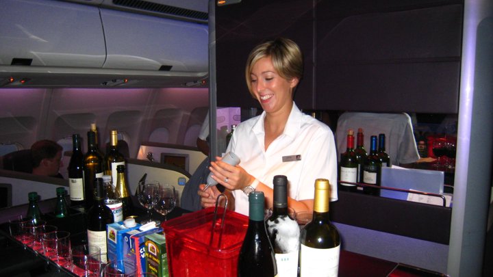 As those of you who normally fly First Class are no doubt aware, when it was time to board, we were first, and were immediately given glasses of champagne to compensate for the travails of the day. Once airborne, you can mix and mingle at the five-stool bar.