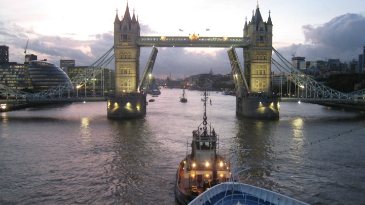 With a maximum of 296 passengers – 240 were aboard on this trip – the ship is small enough to berth this far up the Thames. Later that evening "Rule Brittania" was played as we sailed under Tower Bridge, which had been opened for our passage. It was quite an emotional moment for the many British passengers.