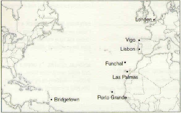 We leisurely proceeded down the Thames on our way to Bridgetown, Barbados, with stops at Vigo, Spain; Lisbon, Portugal; Funchal, Madeira; Las Palmas, Canary Islands; and Puerto Grande, Cape Verde Islands.
