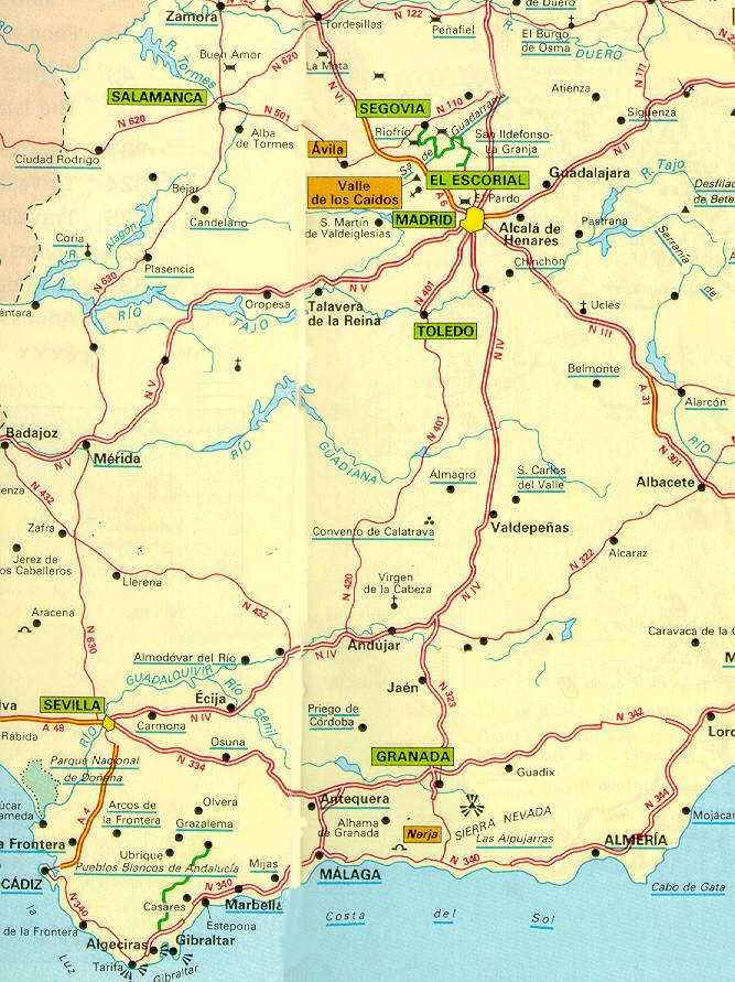 The map below is from the Michelin Green Guide. Michelin deems the towns, or sights, in green to be "worth a journey," those in orange are "worth a detour." In case you wondered, to cut down on visual distractions I've deleted a few other Michelin-highlighted sights that we didn't visit this trip (e.g., Cordoba).